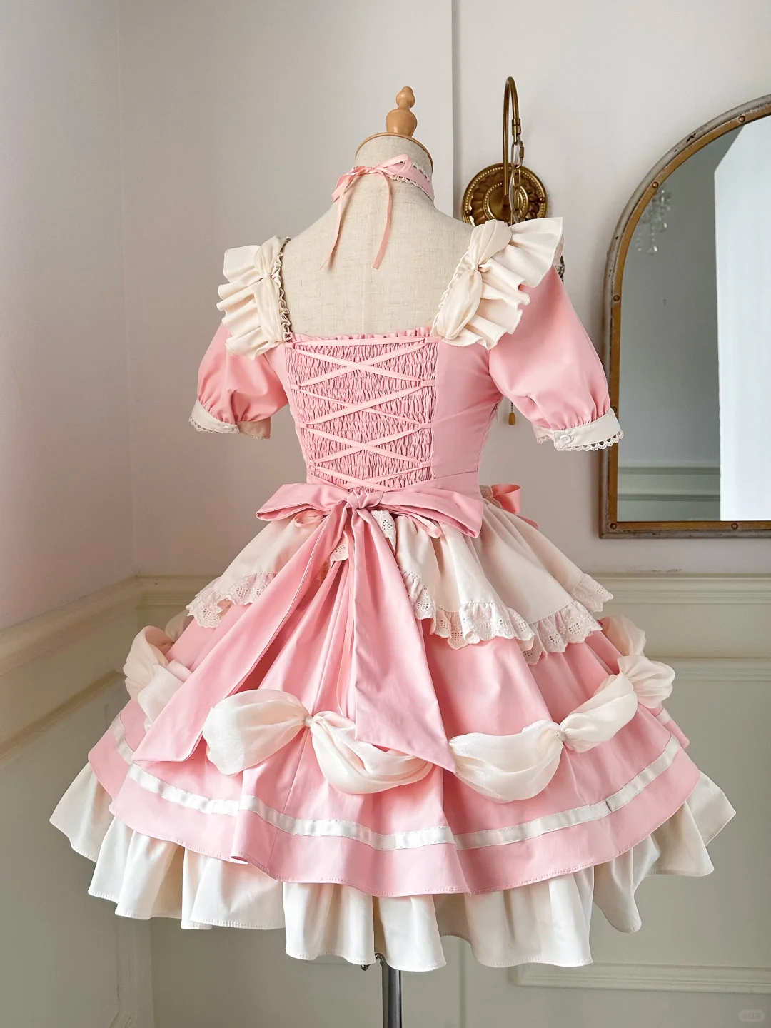 Step into a world of sweetness with this charming pink and white Maid dress. designed to captivate with its delightful details. The dress features a lovely heart-shaped apron adorned with lace. adding a playful yet elegant touch. The bodice is highlighted by a large pink bow with a decorative golden bell. bringing a whimsical charm to the overall look. The puffed sleeves and layered ruffled skirt. accentuated with satin ribbons and tiny bows. create a voluminous and flattering silhouette. Perfect for themed events. tea parties. or just embracing a cute and feminine style. this dress is a must-have for any Maid fashion enthusiast. Feel like a character straight out of a fairy tale with this enchanting piece that combines classic elegance with playful details.