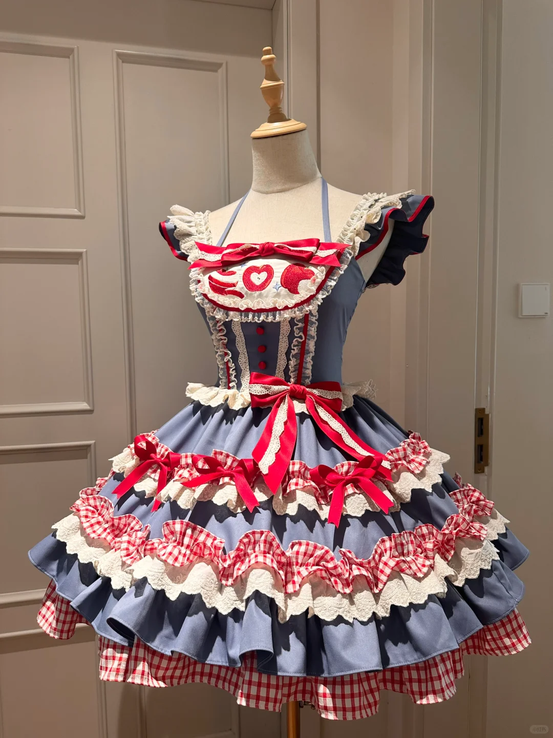 Step into a world of nostalgic charm with this delightful Maid dress. featuring a captivating combination of blue fabric. red gingham patterns. and intricate lace detailing. The bodice is beautifully adorned with a playful heart motif and a large red bow. adding a whimsical touch to the overall design. The layered skirt is enhanced with contrasting ruffles. red bows. and delicate lace. creating a voluminous. eye-catching silhouette. Perfect for those who love to embrace a retro. yet elegant style. this dress is ideal for tea parties. themed events. or simply making a bold fashion statement. Let your personality shine through with this unique and enchanting piece.