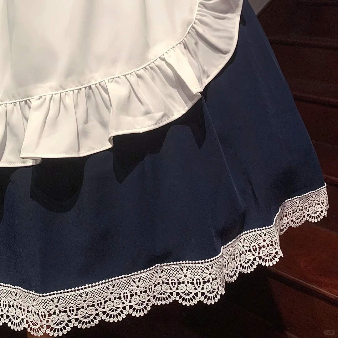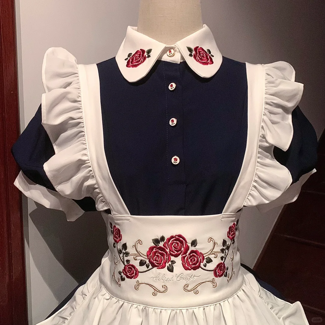 This classic navy blue Maid dress is a perfect blend of elegance and charm. featuring intricate details that capture the essence of timeless fashion. The dress is beautifully complemented by a crisp white apron adorned with delicate ruffles. adding a touch of sweetness to the ensemble. The bodice is highlighted by a white collar with exquisite red rose embroidery. matching the floral motifs on the waistband. creating a cohesive and sophisticated look. The skirt. with its full volume. is edged with white lace trim. enhancing the dress's vintage appeal. Ideal for tea parties. themed events. or adding a touch of refinement to your Maid wardrobe. this dress is designed for those who appreciate the blend of classic and romantic styles.