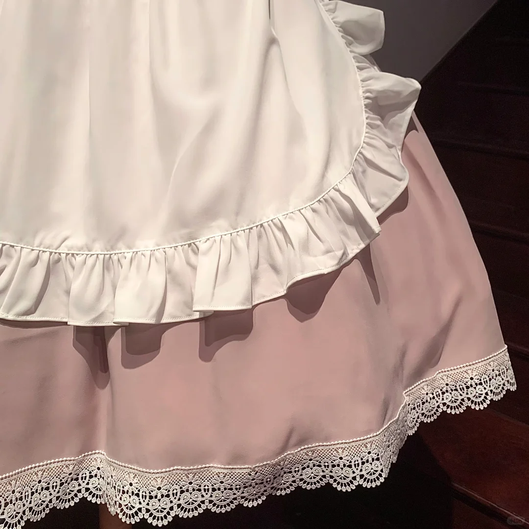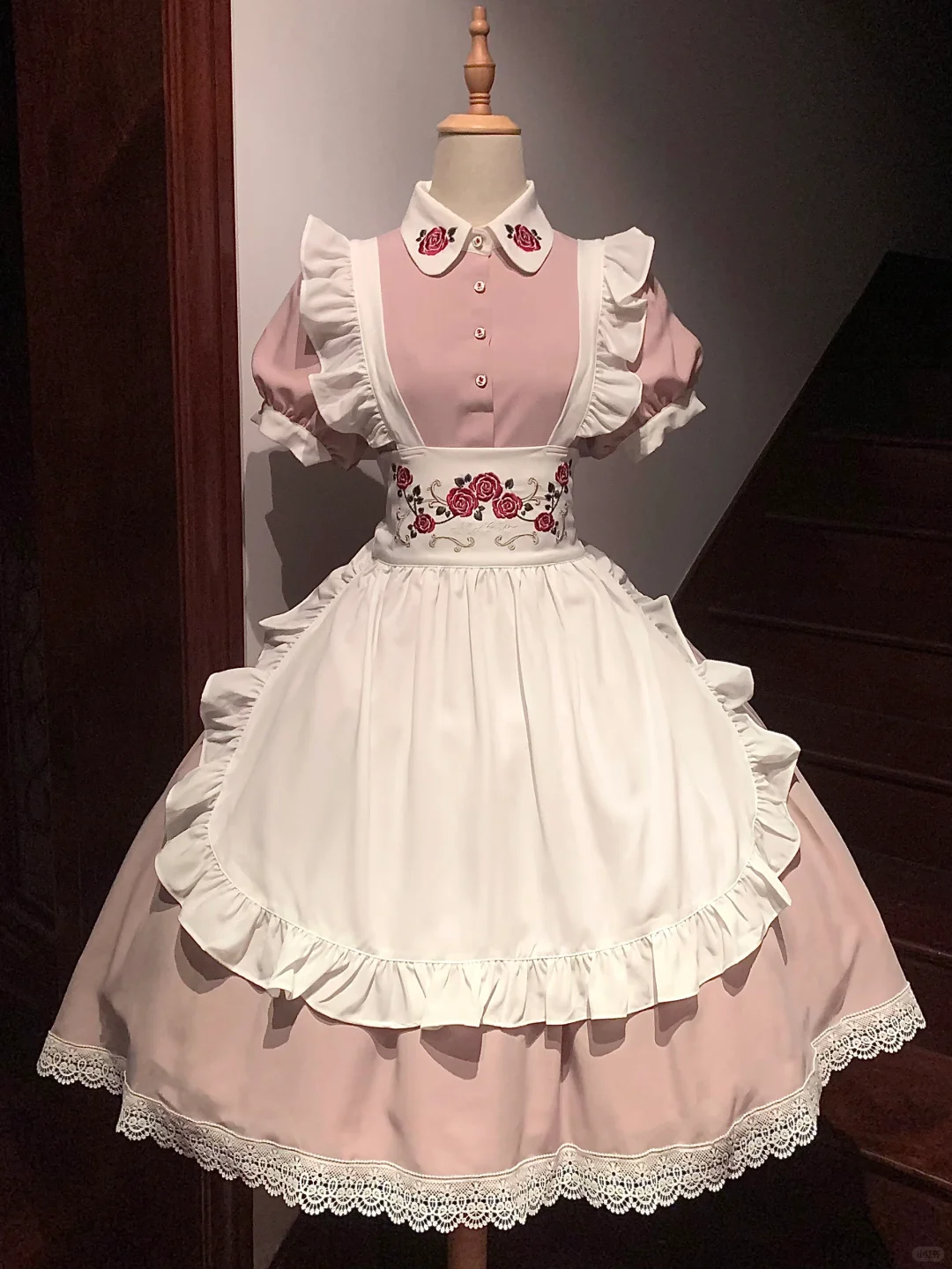 Step into timeless elegance with this vintage-inspired maid dress. featuring a soft pink and white color palette. The dress is meticulously crafted with intricate rose embroidery on the collar and waist. adding a touch of romantic charm. The ruffled sleeves and apron. adorned with delicate lace trim. enhance its classic silhouette. This dress is perfect for those who appreciate traditional aesthetics with a modern twist. ideal for themed events. cosplay. or simply embracing a nostalgic look in your wardrobe. The attention to detail in the design ensures both comfort and style. making it a must-have for any vintage fashion enthusiast.