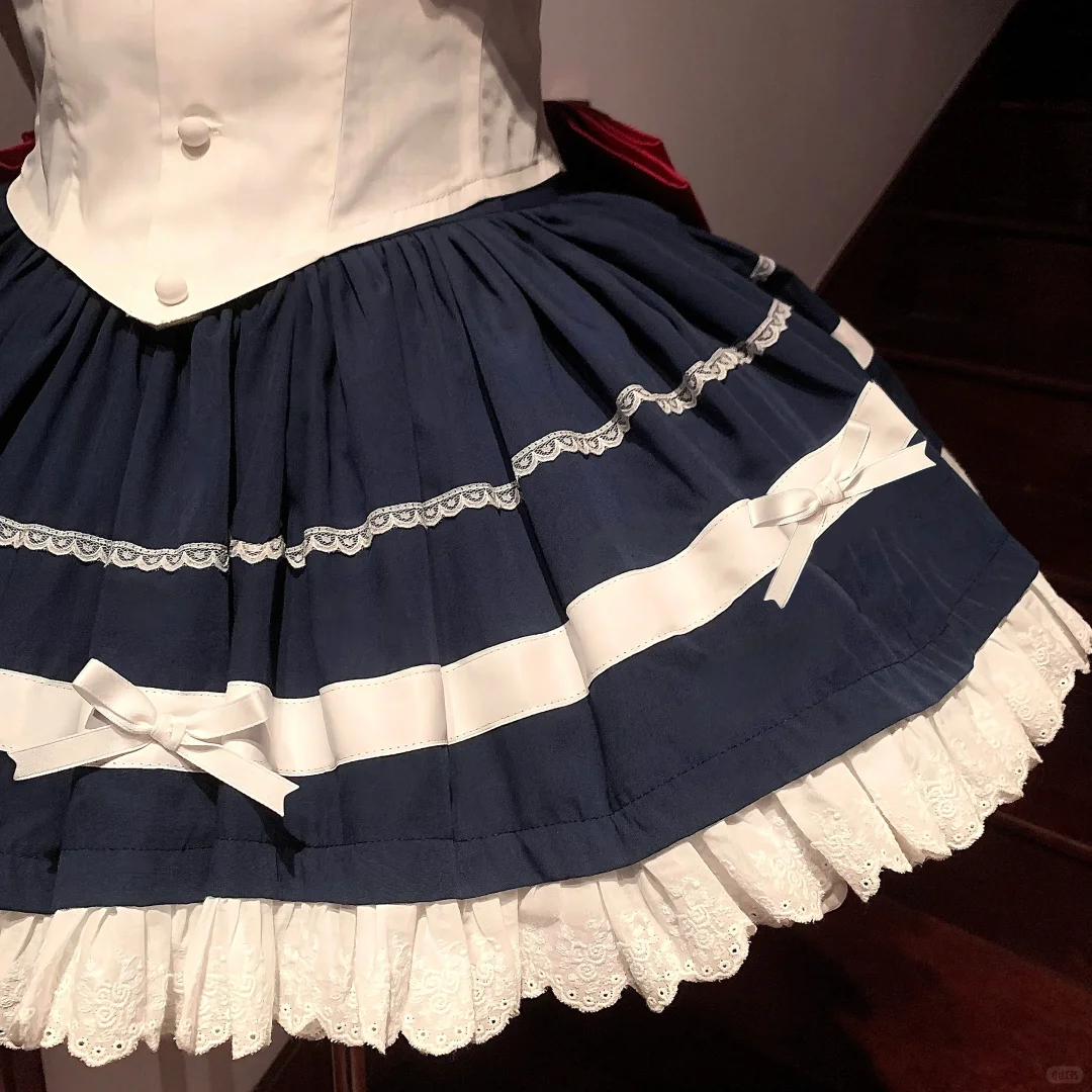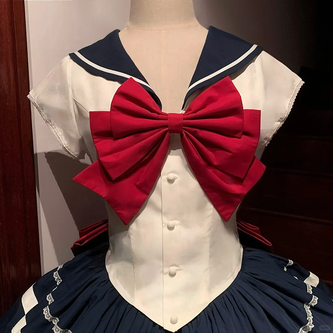 Embrace the timeless charm of schoolgirl fashion with this Navy Blue & White Sailor Maid Dress. This classic outfit features a crisp white top with a bold navy collar. adorned with a striking red bow that adds a pop of color to the ensemble. The dress is elegantly designed with a full. pleated navy skirt. accented by white stripes and delicate lace trim for a soft. feminine touch. The cute short sleeves and buttoned front complete the look. making it perfect for cosplay. themed events. or a unique addition to your Maid wardrobe. Custom sizing is available to ensure the perfect fit. capturing the essence of both tradition and style.