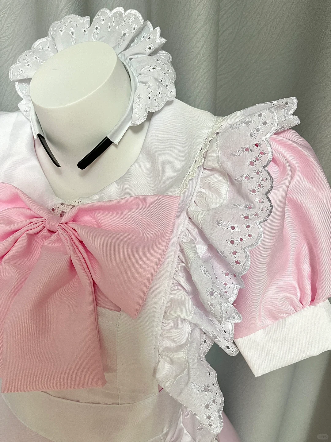 Pink & White Maid Dress with Ruffled Lace and Large Bow - Sweet Pastel Cosplay Outfit