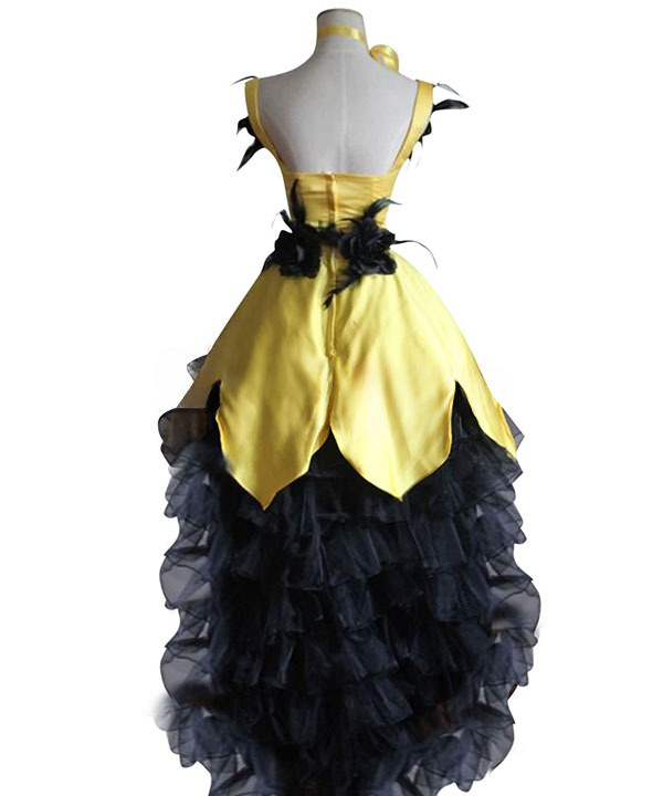 • The dress features a high-low skirt with layered fabrics. The top yellow layer has a scalloped hemline. beautifully contrasting with the black ruffled tulle underneath. adding volume and a dramatic flair.